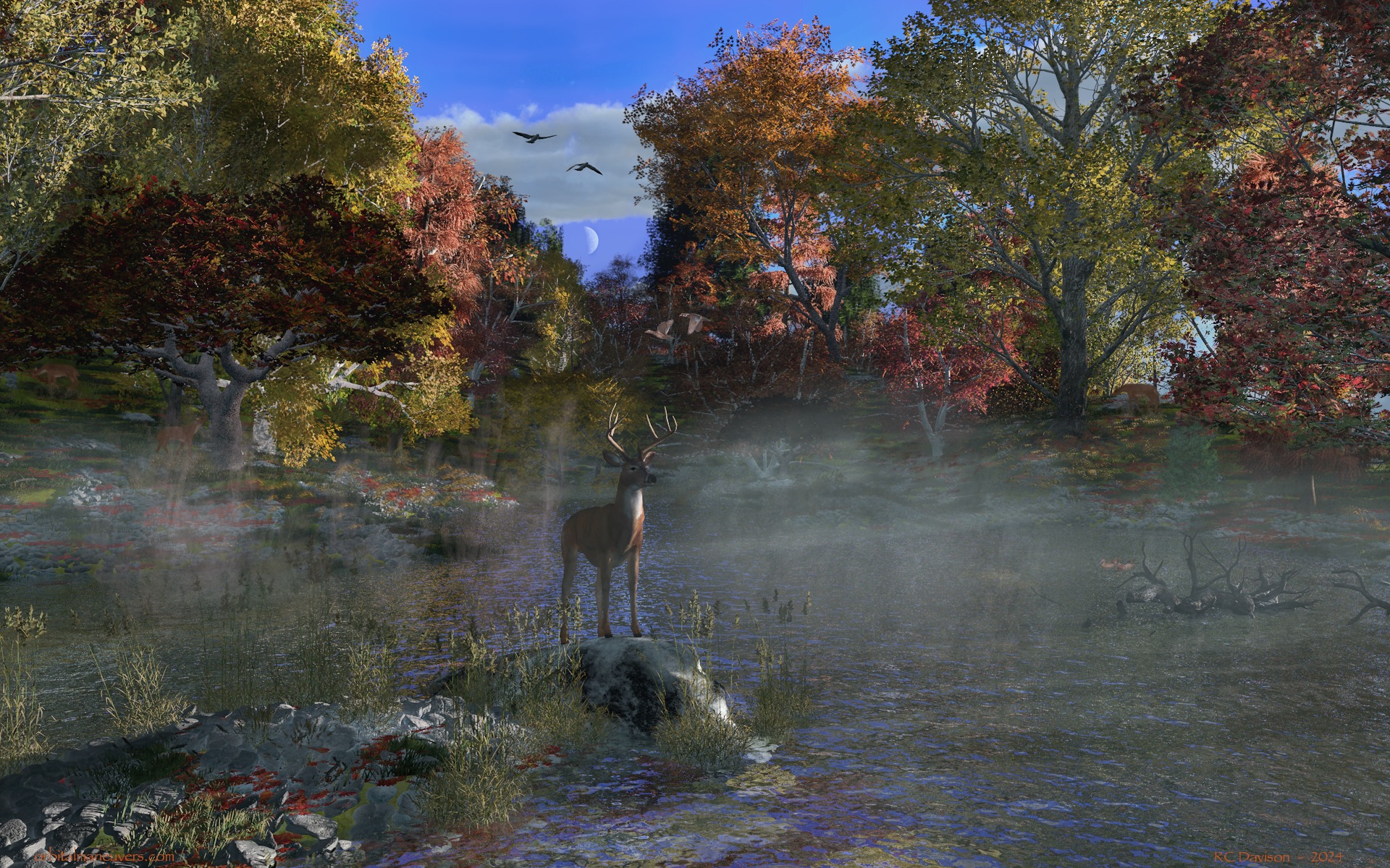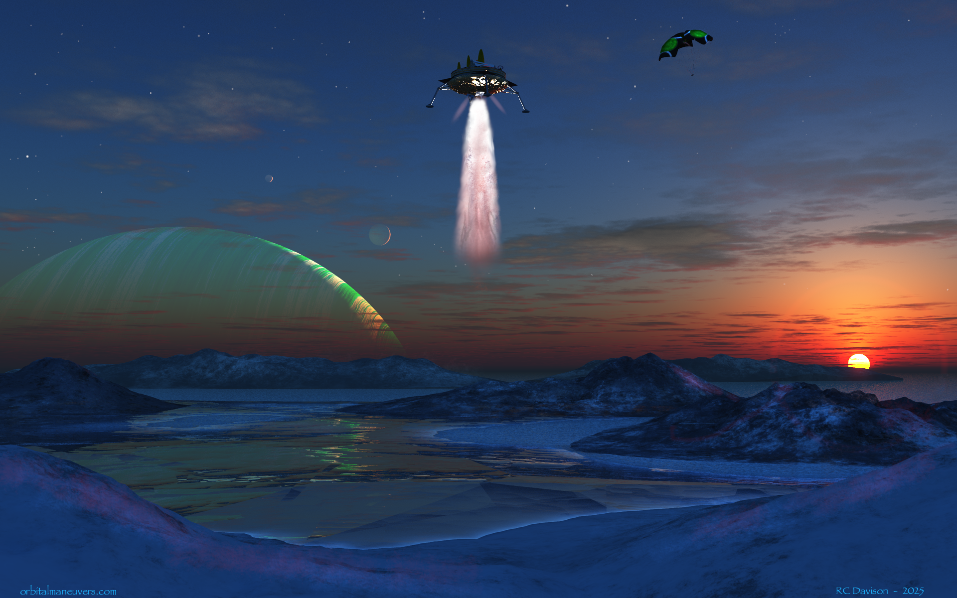 Wallpapers: Images from other places and times Below are some of my dabblings into the world science fiction themed art. Click on the previews for a full size image you can download for personal use. Comments and discussions are always welcome. (rcdavison@orbitalmaneuvers.com) Enjoy! Mountain Valley Meanwhile, back on Earth, a peaceful mountain valley is home to a buck and his harem. An alternate version was created for a rising harvest moon. Moonrise A pair of moons rise over a snow-capped mountain range of an exoplanet. Stormy Seas An exomoon's inhabitants explore their world by harnessing wind power. Orbiting a ringed gas giant in a binary star system, they may one day reach for the stars. Planet Mul A more fantastical piece based on the movie "Valerian and the City of a Thousand Planets." Probe to ICE-9 After releasing its braking chutes, an alien probe fires its retrorockets as it descends onto an icy, watery moon of a gas giant. Autumn Pond Morning Meanwhile, back on Earth, the seasons are changing and the Northern Hemisphere is now enjoying the autumnal colors. A proud buck watches the sun rise over his domain. Interloper An extraterrestrial civilization launches a pair of scientific probes to intercept an interstellar asteroid passing through their solar system. Exoplanet Weather - Sunny with Scattered Showers How many exoplanets, and potentially exomoons, have weather similar to what we experience day-to-day here on Earth? It’s fascinating to think that right now, somewhere out there in the cosmos, it’s raining or snowing or windy along the seashore or just sunny with scattered showers. Some day we may have the means to go see it in person! Nexus Moon's Home Planet Companion image to "Nexus - The Beginning" below. This image presents a view of the moon's home planet. The planet is covered with deserts and dunes, with a thin atmosphere and is devoid of life. All it takes is some water, heat, the right elements and a whole lot of time...Primordial life makes its way out of a lake in an impact crater on an exoplanet's habitable moon. Shades of Autumn Meanwhile, back on Earth in the Northern Hemisphere. Alignment Water on a tidally stressed moon of a gas giant begins to vaporize as the planetary system’s aging star swells in its death throws. Retirement Home With the potential number of habitable exoplanets in the Milky Way Galaxy ranging from 300 million to 6 billion (That’s not counting moons that might be habitable, like Pandora in Avatar.) one might just find this planet. Getting there is another story! Lander "Seven minutes of terror" are magnified a hundred times as a lander lowers a rover to the surface of a cold icy moon with a methane atmosphere and geysers showering the way. JUICE Flyby of Ganymede The European Space Agency’s JUICE (JUpiter ICy moons Explorer) flies over Ganymede during its mission to explore Ganymede, Europa, Callisto and Jupiter. Set to launch in August, 2023 and arrive in the Jovian system in 2031. Pulsar Embers The ruins of a city on a circumbinary planet pays mute homage to the pulsar left in the wake of a supernova of one of the stars. The planet's atmosphere was stripped away in the cataclysm, and its surface is now bathed in X-rays from the young pulsar; one can only hope that it's inhabitants had the technology to escape in time. Harvest Moon and Hallows' Eve Meanwhile, back on Earth it's mid-autumn in the Northern Hemisphere and we celebrate the colors of fall in the setting evening sun with the Harvest Moon. The end of October brings Halloween and we thrill to the those things that lurk in the shadows and go bump in the night! Harvest Moon