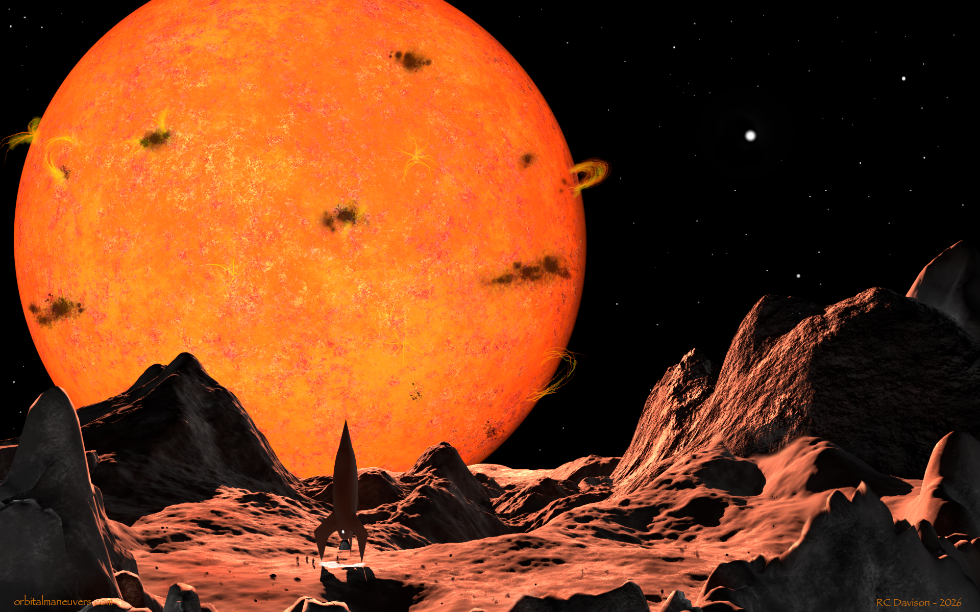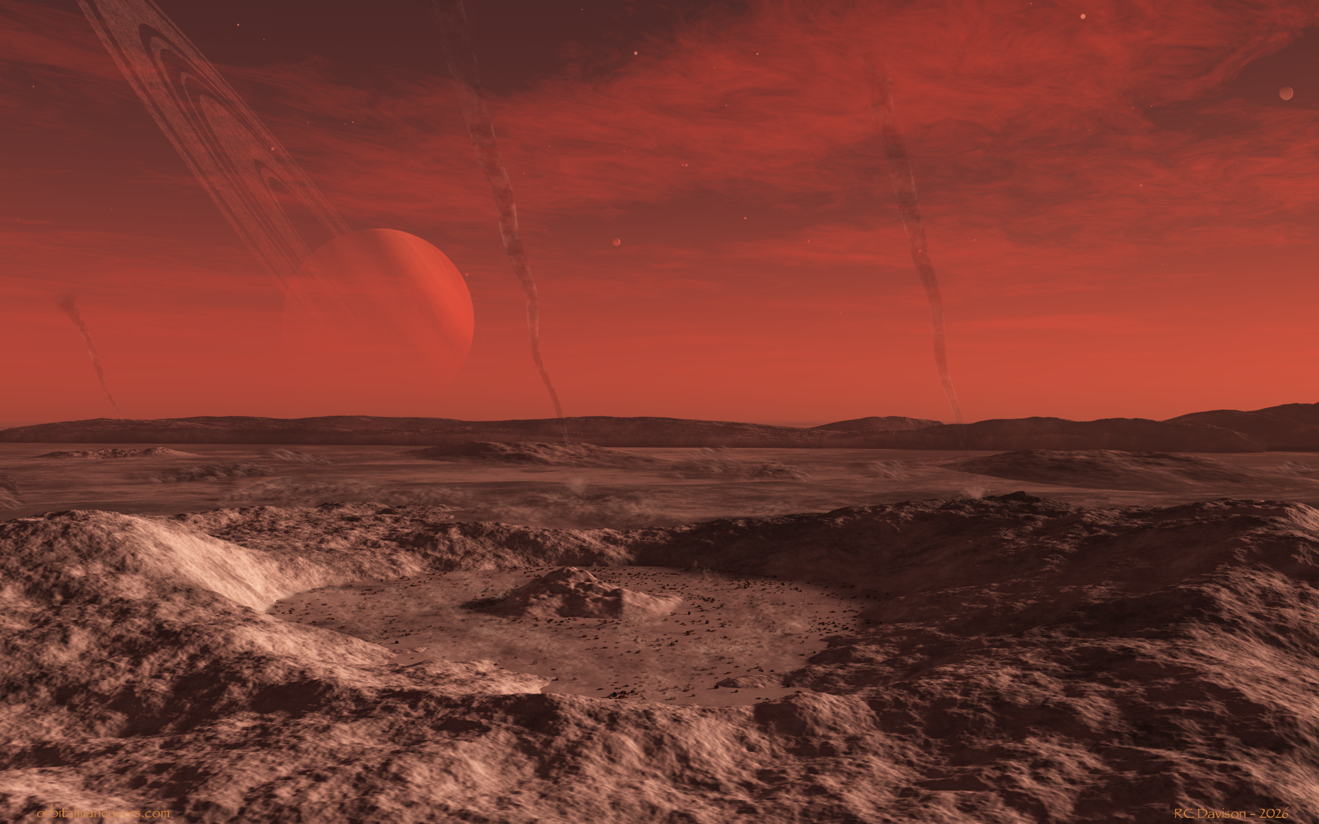 Wallpapers: Images from other places and times Below are some of my dabblings into the world science fiction themed art. Click on the previews for a full size image you can download for personal use. Comments and discussions are always welcome. (rcdavison@orbitalmaneuvers.com) Enjoy! Red Dwarf Expedition A throw back to the 50s and 60s sci-fi movies. A group of intrepid explorers lands on a planet in a close orbit to a very active red dwarf star. Desolata Luna A large Mars-like moon orbits a gas giant in some distant star system. Its thin atmosphere and dusty surface gives rise to dust devils that sweep the moon's surface. Bioluminescent Sunset Small organisms glow with bioluminescent light as the are agitated when waves wash up on the shore on this exoplanet. We see the same phenomena on Earth in the world's oceans and seas. Mountain Valley Meanwhile, back on Earth, a peaceful mountain valley is home to a buck and his harem. An alternate version was created for a rising harvest moon. Moonrise A pair of moons rise over a snow-capped mountain range of an exoplanet. Stormy Seas An exomoon's inhabitants explore their world by harnessing wind power. Orbiting a ringed gas giant in a binary star system, they may one day reach for the stars. Planet Mul A more fantastical piece based on the movie "Valerian and the City of a Thousand Planets." Probe to ICE-9 After releasing its braking chutes, an alien probe fires its retrorockets as it descends onto an icy, watery moon of a gas giant. Autumn Pond Morning Meanwhile, back on Earth, the seasons are changing and the Northern Hemisphere is now enjoying the autumnal colors. A proud buck watches the sun rise over his domain. Interloper An extraterrestrial civilization launches a pair of scientific probes to intercept an interstellar asteroid passing through their solar system. Exoplanet Weather - Sunny with Scattered Showers How many exoplanets, and potentially exomoons, have weather similar to what we experience day-to-day here on Earth? It’s fascinating to think that right now, somewhere out there in the cosmos, it’s raining or snowing or windy along the seashore or just sunny with scattered showers. Some day we may have the means to go see it in person! Nexus Moon's Home Planet Companion image to "Nexus - The Beginning" below. This image presents a view of the moon's home planet. The planet is covered with deserts and dunes, with a thin atmosphere and is devoid of life. All it takes is some water, heat, the right elements and a whole lot of time...Primordial life makes its way out of a lake in an impact crater on an exoplanet's habitable moon. Shades of Autumn Meanwhile, back on Earth in the Northern Hemisphere. Alignment Water on a tidally stressed moon of a gas giant begins to vaporize as the planetary system’s aging star swells in its death throws. Retirement Home With the potential number of habitable exoplanets in the Milky Way Galaxy ranging from 300 million to 6 billion (That’s not counting moons that might be habitable, like Pandora in Avatar.) one might just find this planet. Getting there is another story! Lander "Seven minutes of terror" are magnified a hundred times as a lander lowers a rover to the surface of a cold icy moon with a methane atmosphere and geysers showering the way. JUICE Flyby of Ganymede The European Space Agency’s JUICE (JUpiter ICy moons Explorer) flies over Ganymede during its mission to explore Ganymede, Europa, Callisto and Jupiter. Set to launch in August, 2023 and arrive in the Jovian system in 2031. Pulsar Embers The ruins of a city on a circumbinary planet pays mute homage to the pulsar left in the wake of a supernova of one of the stars. The planet's atmosphere was stripped away in the cataclysm, and its surface is now bathed in X-rays from the young pulsar; one can only hope that it's inhabitants had the technology to escape in time. Harvest Moon and Hallows' Eve Meanwhile, back on Earth it's mid-autumn in the Northern Hemisphere and we celebrate the colors of fall in the setting evening sun with the Harvest Moon. The end of October brings Halloween and we thrill to the those things that lurk in the shadows and go bump in the night! Harvest Moon